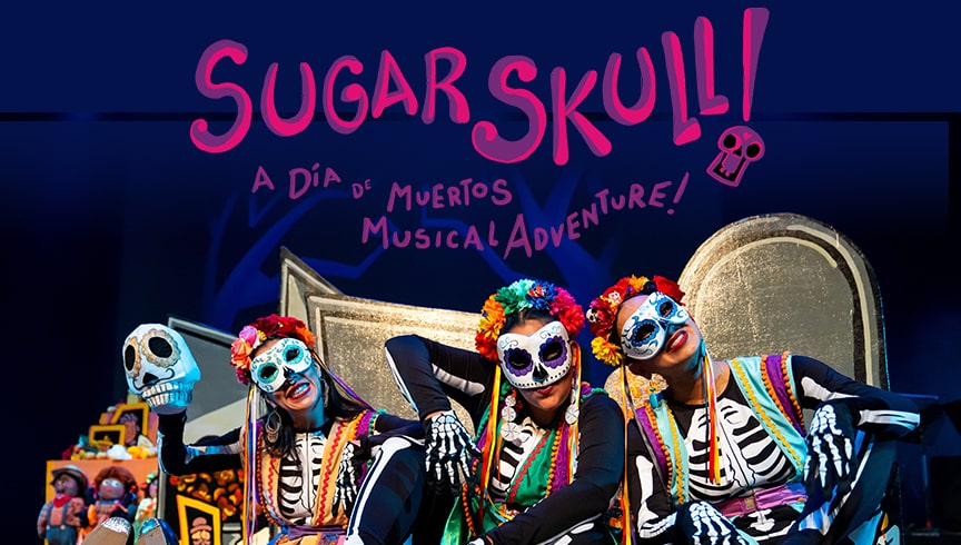 SUGAR SKULL! A Día de Muertos Musical Adventure is a touring bilingual/bicultural musical for young audiences and families that uses traditional regional music and dance from Mexico to tell the story of twelve-year-old Vita Flores. Vita thinks her family has gone loco planning a celebration for deceased loved ones. Why throw a party for the dead? But when a spirited candy skeleton suddenly springs to life, Vita finds herself on a magical, musical journey to unravel the true meaning of Día de Muertos. Meet Sugar Skull, a charismatic skeleton with a secret or two. With her skeletal new friend, Vita dances with ancient ancestors, sings with a sorrowful sorceress, escapes the trickster Chaneques, and even meets the famous Catrina Calavera. But can this clever youth gather the missing pieces needed for her family ofrenda before it’s too late? Featuring an 8 person multi-talented cast of musicians, actors, and dancers.